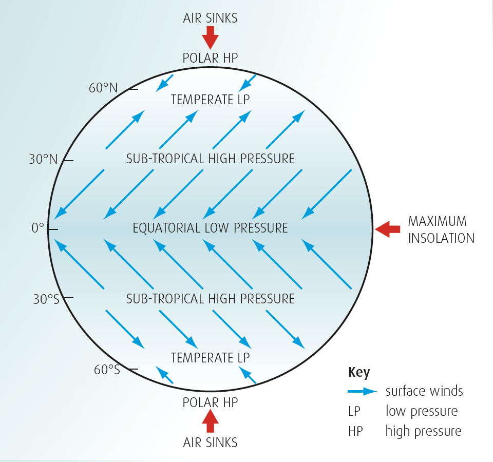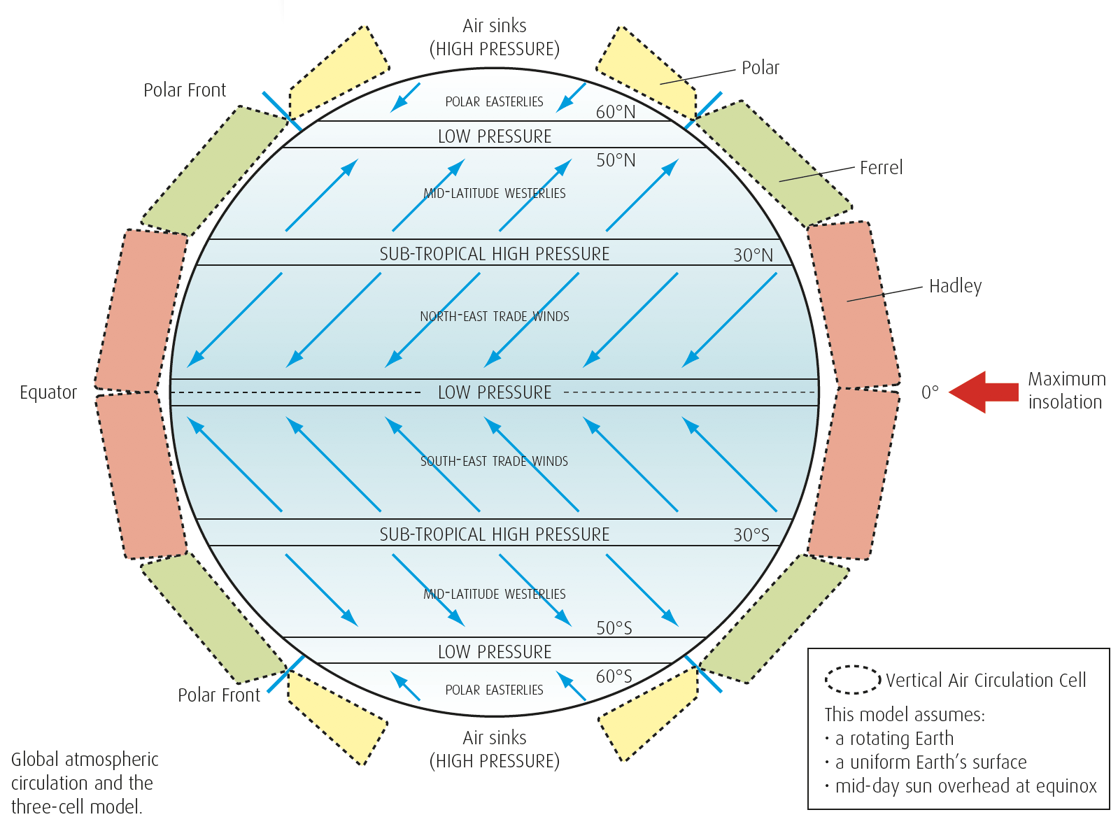 In an ideal situation, air from the tropics (the area of surplus) moves to the poles (the area of deficit). Nature, however, is not so straightforward and there is a three-cell model.