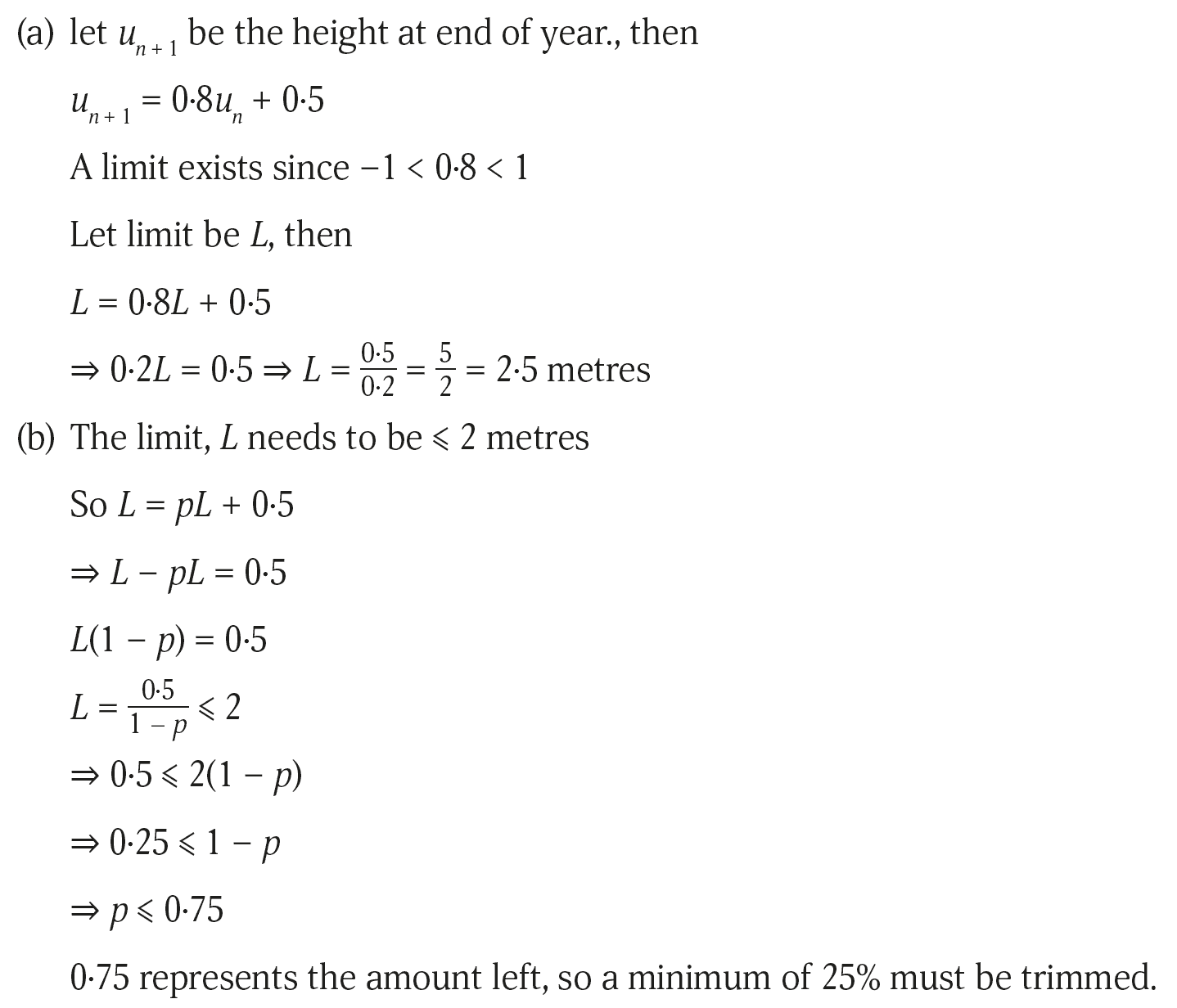 3. A man decides to plant a number of fast-growing trees as a boundary between his property and the property of his next door neighbour. He has been warned, however, by the local garden centre that, during any year, the trees are expected to increase in height by 0.5 metres. In response to this warning he decides to trim 20% off the height of the trees at the start of any year.